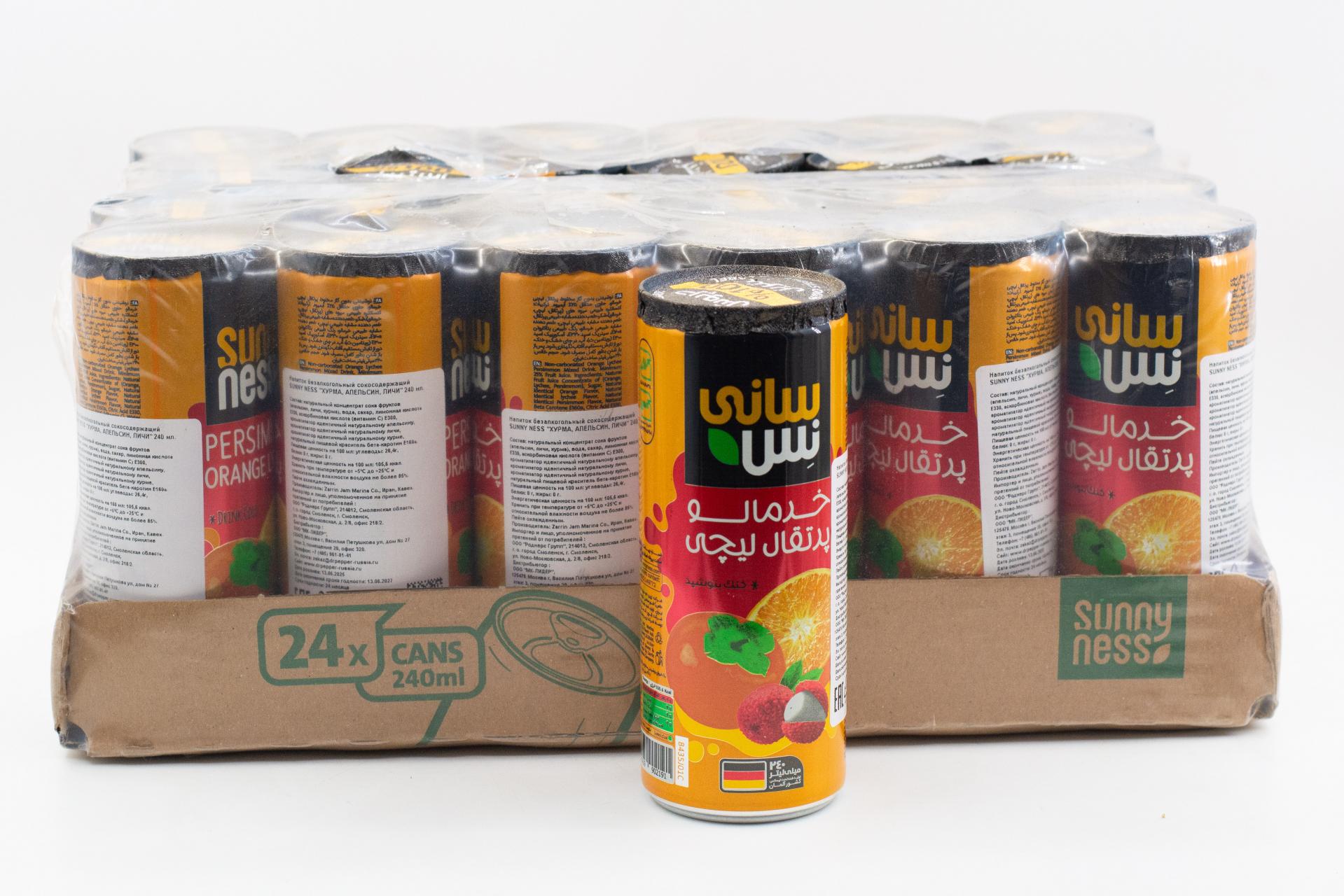 Напиток безалкогольный сокосодержащий Sunny Ness Хурма, апельсин, личи (Иран) 240мл ж/б62,35 руб. за штуку (в упак. 24 шт.) |