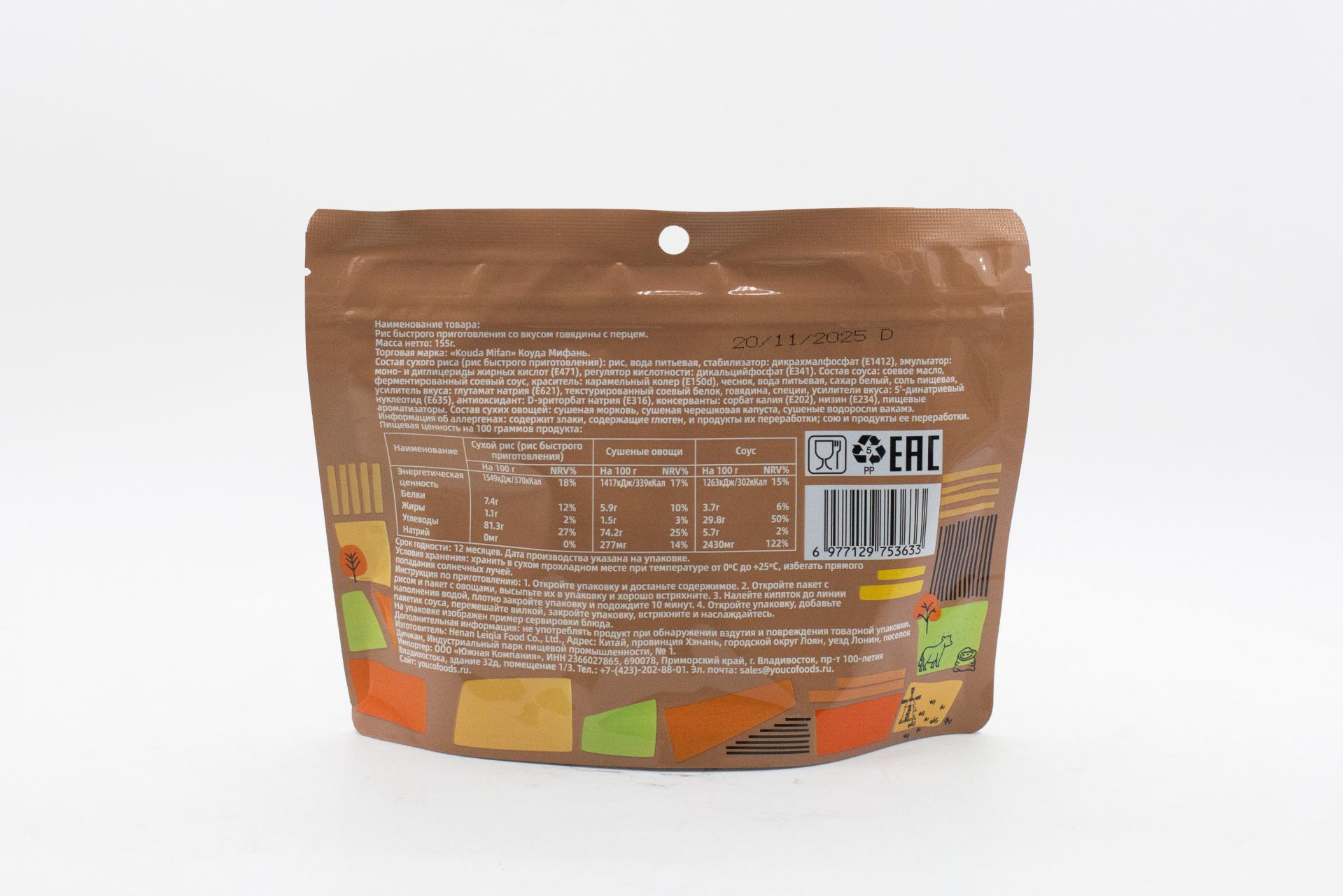 Рис быстрого приготовления Kouda Mifan со вкусом говядины с перцем (Китай) 155г